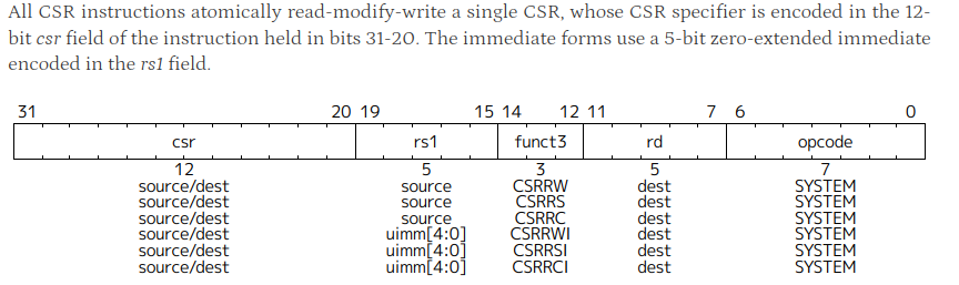 The CSRRWI, CSRRSI, and CSRRCI variants are similar to CSRRW, CSRRS, and CSRRC respectively, except they update the CSR using an XLEN-bit value obtained by zero-extending a 5-bit unsigned immediate (uimm[4:0]) field encoded in the rs1 field instead of a value from an integer register.