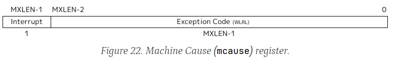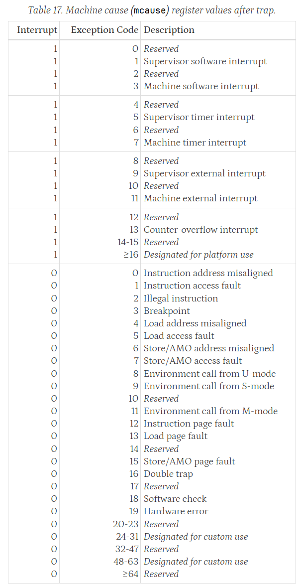 mcause 记录陷入发生时导致其发生的原因代码,寄存器格式及相应原因代码列出如下: