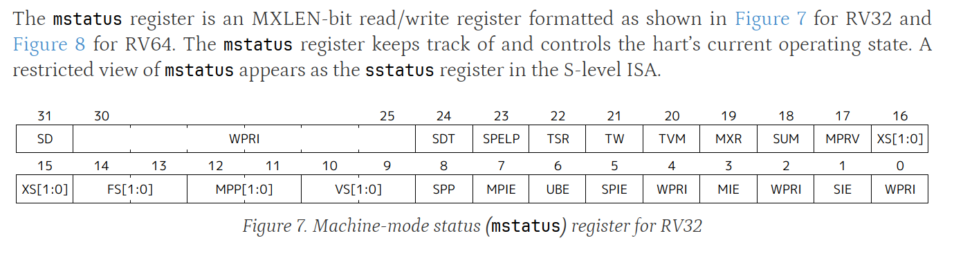 关于更详细的 M 特权级下 CSR 定义,可参考 特权级手册 第三章 Machine-Level ISA ,以下从其中摘取将要实现 CSR 的相应内容,您应能阅读并从中理解相应 CSR 的作用。